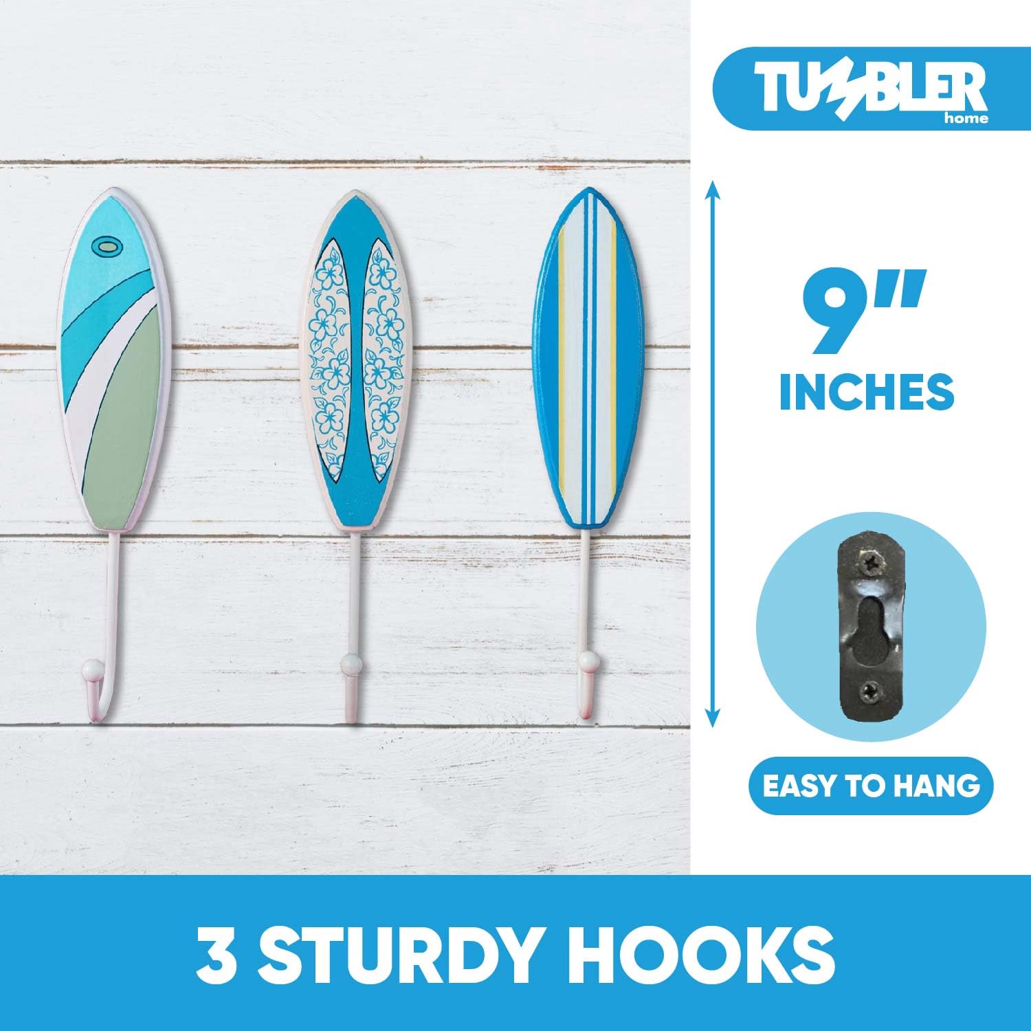 Tumbler Home Tropical Surfboard Wall Hooks – Set of 3 – Blue/Green/White Theme – 9” Tall