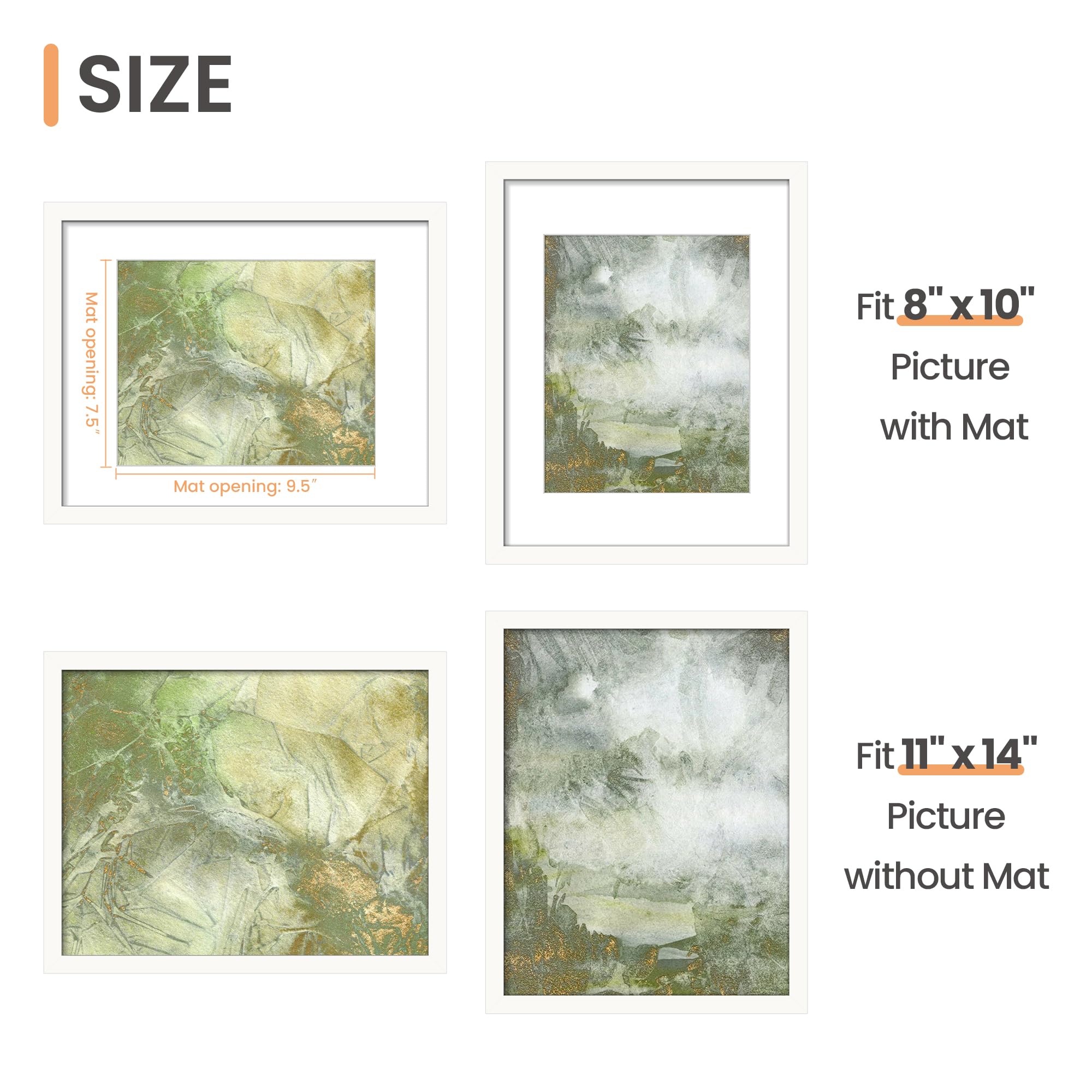 - DOUBLE SIZE DESIGN: White 11x14 inch picture frame perfects for Pictures 8x10 with Mat or 11x14 Without Mat. The display size will be 0.5inch smaller than the photo size to better stable the photo and prevent it from falling off.